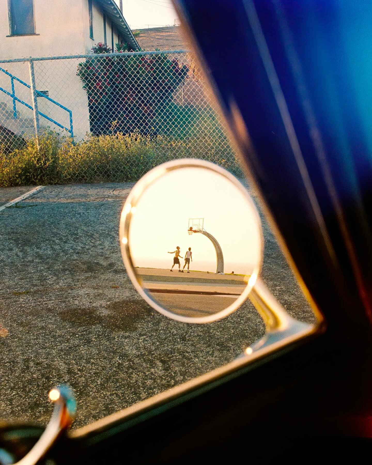Are you the driver? The passenger? One of the people playing basketball? Where are you? Why are you there? Where are you going?